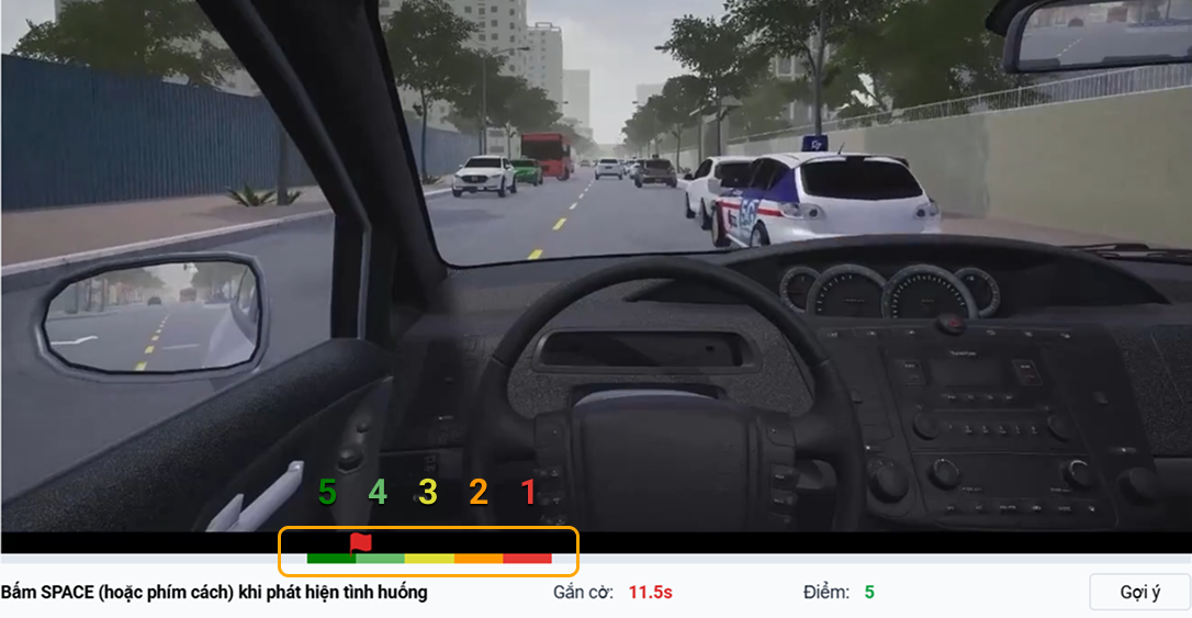 Học viên quan sát kỹ tình huống và xác định thời điểm có tình huống nguy hiểm. Sau đó, nhấn phím CÁCH trên bàn phím để thực hiện việc gắn cờ. Nếu bạn gắn cờ đúng bạn sẽ được tính điểm.